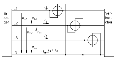 Der umfassendste Fall ist der Vierleiter-Stromkreis mit Neutralleiter und