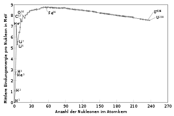 Die Bindungsenergie, die pro Nukleon aufgebracht werden muss, um den Kern vollständig in Nukleonen zu zerlegen, für die auf der Erde natürlich vorkommenden Kerne.