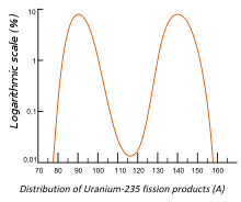 Bei zwei Spaltfragmenten sind viele verschiedene Nuklidpaare möglich. Meist entsteht ein leichteres (Massenzahl um 90) und ein schwereres Spaltfragment (Massenzahl um 140). Die Häufigkeitsverteilung (die Ausbeute aufgetragen als Funktion der Massenzahl des Spaltfragments) hat deshalb zwei Maxima.