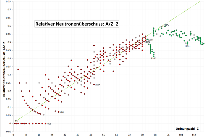 Rot : Relativer Neutronenüberschuss stabiler Nuklide. Er steigt etwa linear mit der Ordnungszahl an.
