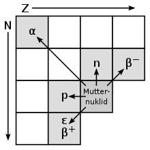 - Bei einem Alphazerfall trägt das Alphateilchen zwei Protonen und zwei Neutronen fort, das Tochternuklid findet sich also zwei Spalten links vom Mutternuklid und zwei Zeilen höher.