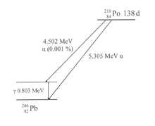 Hier ist nun links ein Alphazerfall gezeigt, und zwar der des von Marie Curie entdeckten Elements Polonium mit der Massenzahl 210. Das Isotop 210Po ist das vorletzte Glied der Uran-Radium-Zerfallsreihe; es zerfällt mit einer Halbwertszeit von 138 Tagen zu einem stabilen Blei-Isotop. In fast allen Fällen erfolgt der Zerfall über Emission einer Alphastrahlung von 5,305 MeV. Nur in einem von 100.000 Fällen erscheint ein Alphateilchen von niedrigerer Energie; der Zerfall führt zu einem angeregten Zustand des 206Pb, der wieder über Gammastrahlung zum Grundzustand führt.