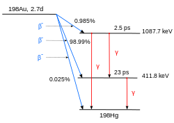 Ein etwas komplizierteres Zerfallsschema ist das des Gold-Isotops 198Au, das man durch Neutronen-Bestrahlung von natürlichem Gold im Kernreaktor erhält. 198Au zerfällt durch Betazerfall zu angeregten Zuständen (oder zum Grundzustand) des Quecksilberisotops 198Hg. Im Bild steht Quecksilber rechts neben Gold, weil Gold die Kernladungszahl 79 hat, Quecksilber die Kernladungszahl 80. Die angeregten Zustände zerfallen nach sehr kurzer Zeit (2,5 bzw. 23 ps; 1 Pikosekunde ist ein Billionstel einer Sekunde) ebenfalls zum Grundzustand.