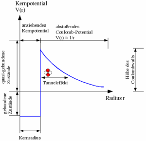 Da die Höhe des Coulombwalls die Energie des Alphateilchens übertrifft, wäre es nach den Gesetzen der klassischen Mechanik nicht möglich, dass das Alphateilchen den Coulombwall überwindet. Klassisch wäre das Alphateilchen also stabil an den Kern gebunden, daher bezeichnet man diesen Zustand als metastabil. Mit einer gewissen Wahrscheinlichkeit, die die Halbwertszeit des Zerfalls bestimmt, verlässt es den Mutterkern jedoch trotzdem mittels des quantenmechanischen Tunneleffekts. Dieser erlaubt es einem Teilchen, eine endlich lange und endlich hohe Energiebarriere mit einer gewissen Wahrscheinlichkeit zu durchdringen, auch wenn seine Energie dafür klassisch nicht ausreicht.