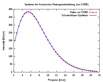 Bei den Experimenten von Penzias und Wilson wurde nur auf einer Frequenz gemessen, weshalb in den folgenden Jahren weitere Messungen auf anderen Frequenzen durchgeführt wurden. Dadurch konnte bestätigt werden, dass es sich bei der Strahlung tatsächlich um Schwarzkörperstrahlung handelt. Diese Art der Strahlung hat den typisch glockenförmigen Intensitätsverlauf, der im Bild dargestellt ist. Da die erdgebundenen Beobachtungsmöglichkeiten im Mikrowellenbereich aufgrund der atmosphärischen Absorption eingeschränkt sind, wurde die Satellitenmission COBE ins Leben gerufen.