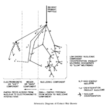 - eine weiche elektromagnetische Komponente, unter anderem durch den Zerfall von π0 und der Zerstrahlung von Positron-Elektronen-Paaren
