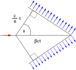 Die Richtung der ausgesandten Strahlung entlang der Flugbahn beschreibt einen sogenannten Mach-Kegel. Der Winkel \theta zwischen Teilchenbahn und Strahlungsrichtung hängt von dem Verhältnis der Geschwindigkeit v=\beta c des Teilchens und der Lichtgeschwindigkeit c'=c/n im Medium mit Brechungsindex n ab: