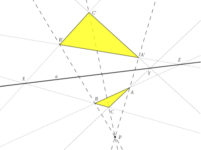 Projektive Form: Wenn sich die Verbindungslinien zwischen korrespondierenden Eckpunkten zweier in einer Ebene gelegenen Dreiecke in einem Punkt schneiden (dem „Zentrum“), so liegen die Schnittpunkte der entsprechend verlängerten Seiten auf einer Geraden (der „Achse“). Die Umkehrung gilt auch.