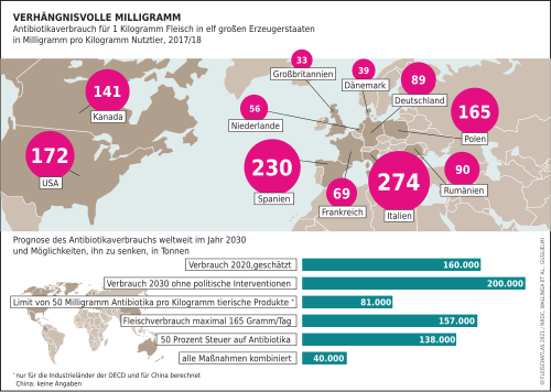 2012 wurden in Deutschland fast 1.620 Tonnen Antibiotika in der Tiermast eingesetzt.[17] Weltweit betrachtet gibt es einen steigenden Trend des Antibiotikaeinsatzes bei der Tierhaltung, wobei er bei der Hühnerhaltung sinkt und bei der Rinderhaltung steigt.[18]>