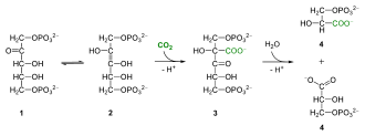 Im Detail wird die CO2-Gruppe an das C2-Atom der Enolform des Ribulose-1,5-bisphosphat addiert. Es entsteht eine enzymgebundene, hypothetische 3-oxo-Säure (Arabinit; genau: 2-Carboxy-3-keto-D-arabinol-1,5-bisphosphat) als instabile Zwischenstufe, die spontan (durch Wasser am C3-Atom hydrolysiert) in zwei Moleküle der Triose-Vorstufe 3-Phosphoglycerat (3-PG) zerfällt. Dabei entstehen aus dem vorher genannten Arabinit (C6) erst ein Molekül D-3-Phosphoglycerat (C3) und ein aus drei C-Atomen bestehendes Carbanion (ebenfalls C3), das durch Protonierung ebenfalls in das primäre Fixierungsprodukt Phosphoglycerat überführt wird. Dadurch werden netto pro gebundenem Kohlenstoffdioxid zwei Moleküle an Phosphoglycerat erzeugt, von denen eines der beiden den neu hinzufixierten Kohlenstoff des Kohlenstoffdioxids enthält.
