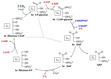 Jeweils sechs Moleküle ATP und sechs NADPH werden zur Reduktion eingesetzt (sechs Moleküle Glycerinsäure-3-phosphat werden zu sechs Glycerinaldehyd-3-phosphat reduziert). Dabei entstehen jeweils sechs ADP, sechs Phosphat und sechs NADP+. Die anderen drei ATP werden bei der Regeneration des Akzeptors verbraucht (drei Moleküle Ribulose-5-P werden zu drei Molekülen Ribulose-1,5-BP phosphoryliert), es entstehen drei ADP.