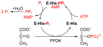Dieses Enzym hat die ungewöhnliche Eigenschaft, eine Phosphatgruppe durch ATP-Hydrolyse (zu AMP) zu aktivieren. Mechanistisch geschieht