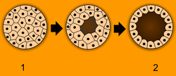 Im Stadium der Morula differenzieren sich die Zellen in eine innere und eine äußere Zellmasse, die sich allerdings äußerlich noch nicht unterscheiden. Dabei bilden die äußeren Zellen untereinander undurchlässige Zellverbindungen (tight junctions) aus, was als Kompaktion (engl. compaction, ‚Verdichtung‘) bezeichnet wird.[2] So trennen sie die innere Zellmasse vom äußeren Flüssigkeitsmilieu. Mit diesem Schritt verlieren die Zellen die Totipotenz und werden pluripotent. Dies bildet die Grundlage für die Bildung der Blastozyste und die Differenzierung in den Trophoblast außen, aus dem Plazenta und Chorion hervorgehen, sowie in den Embryoblast innen, aus dem sich der eigentliche Embryo und Amnion entwickeln.[3] Amnion, Allantois, Chorion und der Dottersack bilden gemeinsam die Eihäute.[4]