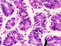 Die Hauptzellen (Exocrinocyti principales) im Hauptteil der Magendrüsen sind hochprismatisch mit einem basal liegenden Zellkern. Sie bilden Pepsinogene, die Vorstufen verschiedener Enzyme, die zusammengefasst als Pepsine bezeichnet werden (bei Wiederkäuern das Lab). Sie werden in sogenannten Zymogengranula in den Zellen zwischengespeichert. Hauptzellen sind durch den großen Anteil an rauem Endoplasmatischem Retikulum (rER) basophil (mit basophilen Farbstoffen anfärbbar, daher bläulich).[1]