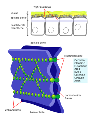 Tight Junctions befinden sich im apikalen (der Außenseite näheren) Bereich der seitlichen Zellmembran und stellen dadurch, dass sie die Bänder von benachbarten Zellen aneinanderbinden, einen sehr engen Kontakt zwischen den Membranen zweier benachbarter Zellen her. Diese Kontakte bilden eine Diffusionsbarriere, die den parazellulären Transport von Molekülen über das Epithel verhindert bzw. kontrolliert (Barrierefunktion). Liegen mehrere Tight-Junction-Stränge hintereinander, steigt die Undurchlässigkeit logarithmisch an. Auf diese Weise können Nahrungsaufnahme und Stofftransport in kontrollierter Weise durch die Epithelzellen erfolgen.