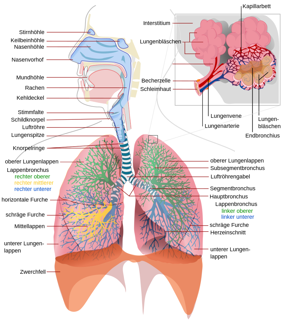 Das Atmungssystem besteht aus den Atemwegen, der Lunge und der Atemmuskulatur, die für die Bewegung der Luft in den Körper und aus dem Körper sorgen