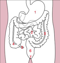 - Blinddarm (Caecum) mit dem Wurmfortsatz (lat. Appendix vermiformis, umgangssprachlich fälschlich als „Blinddarm“ bezeichnet), und