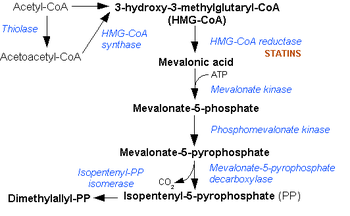 Die Verknüpfung eines weiteren Moleküls Acetyl-CoA mit Acetoacetyl-CoA zu 3-Hydroxy-3-methylglutaryl-CoA (HMG-CoA) in den Mitochondrien benötigt die zytosolische Isoform des Enzyms HMG-CoA-Synthase (HMGCS1).