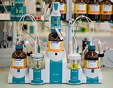 Unter der Karl-Fischer-Titration (auch einfach KFT genannt) versteht man die quantitative Wasserbestimmung durch Titration. Das Verfahren wurde 1935 vom deutschen Chemiker Karl Fischer, bei der Lazăr Edeleanu GmbH, entwickelt.[1] Es fand Eingang in praktisch alle Arzneibücher. Gelegentlich werden auch die anglisierten Bezeichnungen Karl Fisher Titration oder Fisher Titration verwendet.