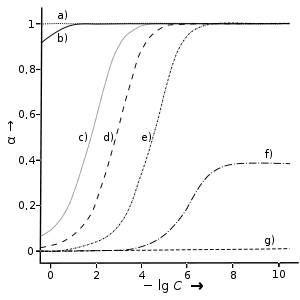 Bei Säuren mit einem Wasserstoffatom lässt sich der Dissoziationsgrad über konduktometrische Messungen bestimmen nach der Formel: