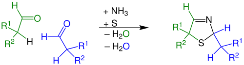 Zweiter Schritt: Der α-Mercaptoaldehyd reagiert irreversibel mit einem zweiten Aldehyd-Molekül und Ammoniak zum 3-Thiazolin. Das zweite Aldehyd-Molekül tritt hier als „Oxokomponente“ in die Ringschlussreaktion ein. Es handelt sich um eine α-Amino-alkylierung einer SH-aciden Verbindung mit folgender cyclischer Stabilisierung durch Wasserabspaltung.