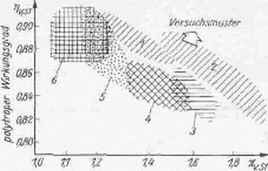 Wichtig für die Verbesserung der Kennwerte ist die Erhöhung des Wirkungsgrades der unter hoher Belastung arbeitenden Turbinen. Auf der Grafik ist dargestellt, daß der Wirkungsgrad eines Axialverdichters bei Steigerung des mittleren Druckverhältnisses einer Stufe eine sinkende Tendenz aufweist.