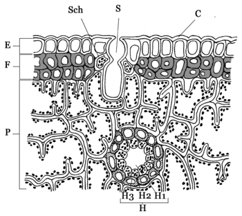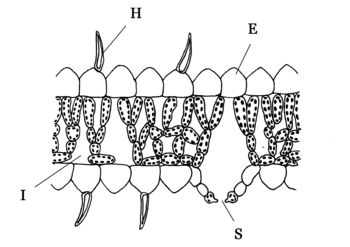 - Bei äquifazialen Blättern (F, G) sind Ober- und Unterseite gleich mit Palisadenparenchym versehen, dazwischen liegt das Schwammparenchym. Ein typisches Beispiel ist das Nadelblatt der Kieferngewächse (G).