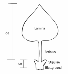 Ein Blatt ist unterteilt in das Unterblatt (Hypophyll), bestehend aus dem Blattgrund und den Nebenblättern (Stipulae), und in das Oberblatt (Epiphyll), das sich wieder in Blattspreite (Lamina) und Blattstiel (Petiolus) gliedert. Nicht bei allen Blättern sind alle Teile ausgebildet, alle Teile unterliegen einer mannigfachen Variation.