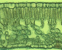 Als Mesophyll bezeichnet man das Assimilationsgewebe. Es ist meist in das unter der oberen Epidermis gelegene Palisadenparenchym und das darunter gelegene Schwammparenchym gegliedert. Das Palisadenparenchym besteht aus ein bis drei Lagen langgestreckter, senkrecht zur Blattoberfläche stehender, chloroplastenreicher Zellen. Im Palisadenparenchym, dessen Hauptaufgabe die Photosynthese ist, befinden sich rund 80 Prozent aller Chloroplasten. Das Schwammparenchym besteht aus unregelmäßig geformten Zellen, die aufgrund ihrer Form große Interzellularräume bilden. Die Hauptaufgabe des Schwammparenchyms ist es, die Durchlüftung des parenchymatischen Gewebes zu gewährleisten. Die Zellen sind relativ arm an Chloroplasten.