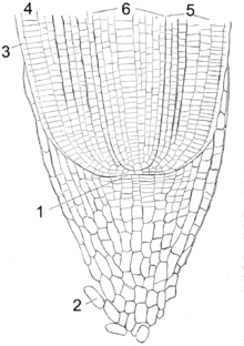 Das Wachstum der Wurzel erfolgt mittels Wurzelspitzenmeristem. Bei den Farnen ist dies eine tetragonale, vierschneidige Scheitelzelle, die nach allen vier Richtungen Zellen abgliedert. Bei den anderen höheren Pflanzen wird das Meristem von einer Gruppe von Initialzellen gebildet.