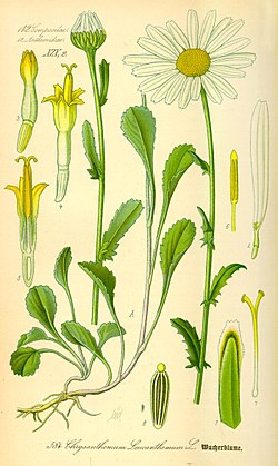 Margerite (Leucanthemum vulgare), Asteroideae, Illustration: (2) zygomorphe Zungenblüte mit drei Kronzipfeln, (3), (4) und (5) radiärsymmetrische Röhrenblüte | ||||||||||||