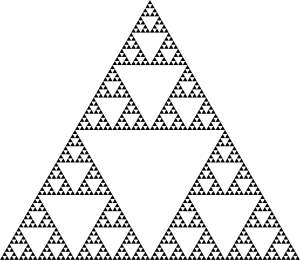 Das Sierpinski-Dreieck ist ein 1915 von Wacław Sierpiński beschriebenes Fraktal – mitunter auch Sierpinski-Fläche oder -Dichtung genannt, welches eine selbstähnliche Teilmenge eines meist gleichseitigen Dreiecks ist. Teilt man das Dreieck in vier zueinander kongruente und zum Ausgangsdreieck ähnliche Dreiecke, deren Eckpunkte die Seitenmittelpunkte des Ausgangsdreiecks sind, dann sind die Teilmengen des Fraktals in den drei äußeren Dreiecken skalierte Kopien des gesamten Fraktals, während das mittlere Teildreieck nicht zum Fraktal gehört. Diese Aufteilung des Fraktals in skalierte Kopien kann in den äußeren Teildreiecken rekursiv fortgesetzt werden. Die fraktale Dimension des Sierpinski-Dreiecks beträgt