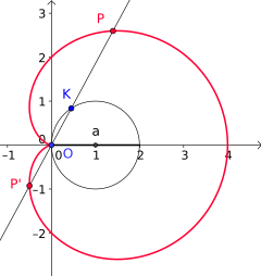 Diese Kurve kann man auch anders erhalten, und zwar als Kreiskonchoide (Pascalsche Schnecke): Man zeichnet von einem Punkt auf dem Kreisumfang eine Sehne und verlängert sie um den Kreisdurchmesser. Wenn die Sehne sich dreht, beschreibt der Endpunkt der Verlängerung eine Kardioide.