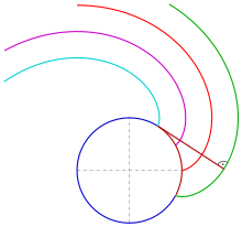 Die Evolventen einer Kurve bilden eine Schar paralleler Kurven. Zum Beispiel bilden die Kreisevolventen eine Schar paralleler Spiralen (s. Bild).