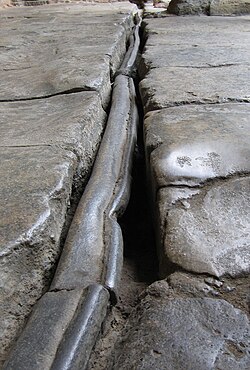 Im römischen Reich dagegen wurde der Stoff für eine Vielzahl von Anwendungsbereichen genutzt. Dabei wurden dem Material teilweise auch besondere übernatürliche Eigenschaften zugesprochen, sodass es häufig für Fluchtafeln, Amulette oder ähnliche Objekte genutzt wurde.[17] Von besonderer Bedeutung war das Blei daneben beispielsweise in der Architektur, wo Steinblöcke mithilfe von Bleiklammern aneinander befestigt wurden. So wurden für die Errichtung der Porta Nigra in Trier schätzungsweise sieben Tonnen Blei verbaut.[18] Weitere wichtige Einsatzbereiche waren die Verkleidung von Schiffsrümpfen zum Schutz vor Schädlingsbefall und die Herstellung von innerstädtischen Wasserleitungen. Hinzu kam die Nutzung von Blei als Rohstoff für die Herstellung von Gefäßen, als Material von Schreibtafeln oder für die sogenannten Tesserae, die zum Beispiel als Erkennungs- oder Berechtigungsmarke dienten.[19] Kleine Bleistücke, die sogenannten „Schleuderbleie“, dienten im römischen Heer als Schleudergeschoss.[20] Aufgrund des hohen Bedarfs fand auch ein Handel mit Blei über weite Strecken statt, der sich unter anderem durch Inschriften auf römischen Bleibarren nachweisen lässt.[19]