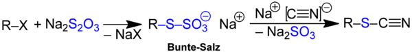 Thiocyansäureester kann man aus Bunte-Salzen und Natriumcyanid in einer Stufe synthetisieren.[7]