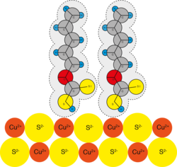 Vereinfachte Darstellung der Bindung von Xanthogensäurepentylester an Kupferkies. Je ein Wasserstoffatom liegt, an Kohlenstoff gebunden, hinter der Zeichenebene. (Nach Hagihara, 1952)