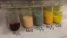 Zur Schwefelwasserstoffgruppe gehören nämlich nur diejenigen Elemente, die mit dem Trennmittel schon in saurem Milieu schwerlösliche Sulfide bilden (Fällungsreaktion; Sulfid-Beispiele im Bild rechts, von links nach rechts: Niederschläge mit Mangan(II)-, Cadmium(II)-, Kupfer(II)-, Zink(II)-, Antimon(III)-, Bismut(III)-, Blei(II)- und Zinn(IV)-Kationen). Zur Ammoniumsulfidgruppe gehören die nur im basischen Milieu ausfällbaren Metallsulfide. Sie sind bei Zugabe von Säuren löslich (s.o.). Neben den Sulfiden gibt es noch die ihnen verwandten Thio- und Sulfosalze. Hier sind Sauerstoffatome gegen Schwefelatome ausgetauscht worden (Beispiel: Natriumthiostannat und -thioantimonat, Natriumthiosulfat/Fixiersalz).