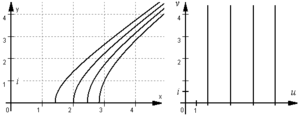 x2 - y2 = const gehen in vertikale Parallelen u = const über. Die zur ersten Winkelhalbierenden symmetrisch liegenden Hyperbeln 2xy = const gehen in waagrecht verlaufende Parallelen über.
