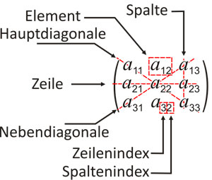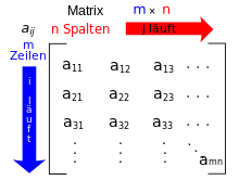 Eine Anordnung, wie in nebenstehender Abbildung, von m \cdot n Elementen {\displaystyle a_{ij}\,} erfolgt in m Zeilen und n Spalten. Die Verallgemeinerung auf mehr als zwei Indizes wird auch Hypermatrix genannt.