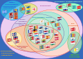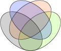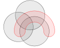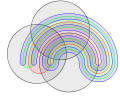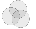 Solche Venn-Diagramme lassen sich einfach in Euler-Diagramme umformen, wie die folgende Grafik zeigt. Venn-Diagramme haben den Vorteil, dass man keine Überschneidung vergessen kann, so dass sie auch für Beweise geeignet sind. Dagegen lässt sich bei Euler-Diagrammen intuitiver erfassen, welche Mengen ineinander liegen oder sich überschneiden.