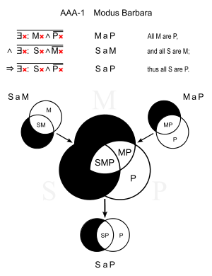 Die folgenden Grafiken zeigen, wie Venn-Diagramme seit dem 17. Jahrhundert zur Veranschaulichung von Syllogismen genutzt werden. Die Gültigkeit eines Schlusses kann mit dieser Methode überprüft werden. (So sieht man etwa, dass der Modus Darapti nur unter Voraussetzung eines nichtleeren Mittelbegriffs gültig ist.)