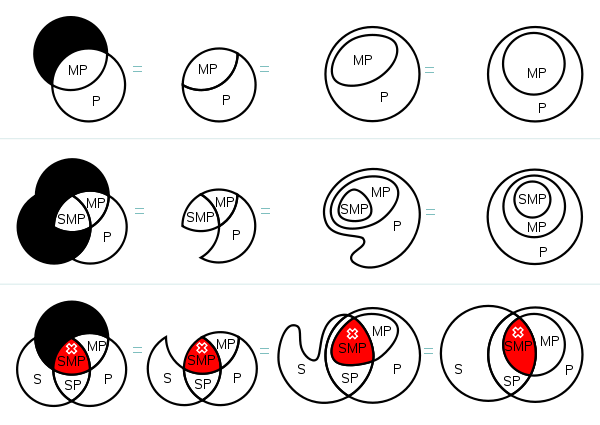 Barbara mittels Venn-Diagrammen: Es gibt keine M außerhalb von P, es gibt keine S außerhalb von M; also gibt es keine S außerhalb von P. |