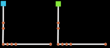 In der Visualisierung rechts sind zwei identisch aufgebaute Kurven zu sehen, die keine homogene Parametrisierung aufweisen, also zum Beispiel eine hohe Punktdichte unten links. Der blaue Würfel respektiert die CV-Verteilung nicht, während er die Kurve abfährt. Stattdessen bewegt er sich mit konstanter Geschwindigkeit und geht damit von einer homogenen Parametrisierung aus. Der grüne Würfel rechts dagegen respektiert die unterschiedliche Punktdichte und verlangsamt seine Geschwindigkeit stets da, wo die CVs eng aneinander stehen. Beide Animationen haben die gleiche Länge von 200 Einzelbildern.