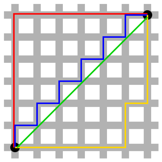 So ist beispielsweise in der nebenstehenden Grafik die Manhattan-Metrik in einem zweidimensionalen Raum, sodass sich
