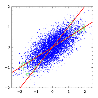 Darstellung einer Regressionsabschwächung durch eine Reihe von Regressionsschätzungen in Fehler-in-den-Variablen-Modellen. Zwei Regressionslinien (rot) begrenzten den Suchraum aus pontenziellen Regressionsfunktionen.