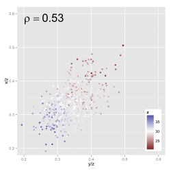 Die nebenstehende Abbildung zeigt 500 Beobachtungen von x/z gegen y/z aufgetragen. Die Stichprobenkorrelation beträgt 0,53, obwohl x, y und z statistisch unabhängig voneinander sind (d. h., die paarweisen Korrelationen zwischen ihnen sind null). Die z-Werte sind auf einer Farbskala hervorgehoben.Vor dieser Art der Scheinkorrelation wurde schon von Pearson gewarnt. In der Literatur wird angemerkt, dass insbesondere in molekularbiologischen Anwendungen diese Art der Scheinkorrelation auftreten kann.