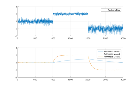 Nebenstehend ist exemplarisch das Verhalten der hier angegebenen Rekursions-Gleichungen, bei einem einfachen instationären, stochastischen Prozess (bereichsweise normalverteilt) zu sehen. Im Verlaufe der Zeit weisen der Erwartungswert sowie die Varianz der Zufalls-Daten ein sprunghaftes Verhalten auf. Die einfache Rekursionsgleichung ohne Vergessensfaktor (Arithmetic Mean 1) reagiert nur sehr träge auf das Verhalten des Datensatzes. Wohingegen die Rekursionsgleichungen mit Vergessensfaktor (Arithmetic Mean 2 & 3, {\displaystyle \gamma =0.988}) deutlich schneller reagieren. Es fällt weiterhin auf, dass die Algorithmen mit Vergessensfaktor zu einem etwas größeren Rauschen führen. In diesem Beispiel sollte jedoch klar sein, dass die schnellere Reaktionszeit Vorrang hat. Die Ergebnisse "Arithmetic Mean 2" und "Arithmetic Mean 3" unterscheiden sich hier nur sehr gering voneinander. Je nach Datensatz, vor allem je nach Menge an Daten, kann dies deutlich anders aussehen.