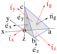Cauchy’s Tetraederargument für die Einführung des Spannungstensors kann an einem, aus einem Körper herausgeschnittenen, Tetraeder eingesehen werden, siehe Abbildung rechts. Drei der Flächen des Tetraeders seien parallel zu einer beliebigen Orthonormalbasis ausgerichtet und im Schnittpunkt dieser drei Flächen liege der Ursprung (o im Bild) eines kartesischen Koordinatensystems mit x-, y- und z-Richtungen. Die Kanten des Tetraeders haben vom Ursprung aus gesehen die Längen a, b und c in negativer x-, y- bzw. z-Richtung. So besitzen die Flächen die Flächenelemente (Flächeninhalt mal Normale):