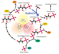 Als einleitender Schritt im Calvin-Zyklus addiert RuBisCO ein Molekül Kohlenstoffdioxid (CO2) an Ribulose-1,5-bisphosphat. Die dabei entstehende Verbindung 2-Carboxy-3-keto-D-arabinitol-1,5-bisphosphat zerfällt unter Zugabe von H2O in zwei Phosphoglycerat-Moleküle, die weiter zu Kohlenhydraten aufgebaut werden. Die Energie für diese Reaktionen stammt in Form von ATP aus der Photosynthese, also vom Sonnenlicht, oder, wie im Fall einiger chemolithotrophen Bakterien, aus den Reaktionen der Chemosynthese (Chemotrophie).